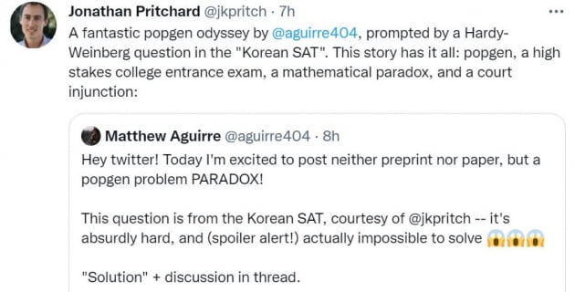 미국의 스탠퍼드 대학 석학 프리차드 교수측은 트위터를 통해 한국의 수능문제 생명과학2 20번 문제의 오류를 지적했다. 사실상 문제 보기 중 어느 조건도 맞는지 틀린지 알수 없고, 모순된다는 입장이다.