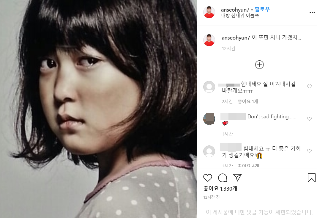 본인 인스타 계정을 통해 내방 침대위 이불속에서 "이 또한 지나 가겠지..." 라고 학교2020 여주 캐스팅에 대한 심경을 공개하며 많은 이들이 응원을 보내고 있다. 율천고등학교 입학 예정인 배우 안서현은 지난해부터 기다린 학교2020 하차 소식과 앞으로 활동할 모습에 팬들의 기대감도 받고 있다.