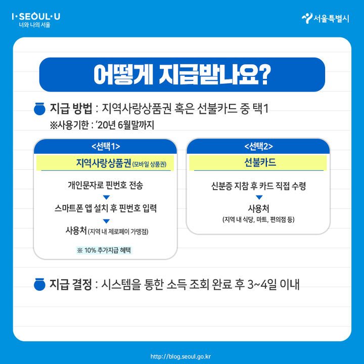 지역사랑상품권 혹은 선불카드로 지급합니다. 지역사랑상품권을 선택할 경우 10% 추가 지급 혜택을 받을 수 있습니다. 선불카드는 지역 내 식당, 마트, 편의점에서 사용 가능하고, 지역사랑상품권의 경우 지역 내 제로페이 가맹점에서 사용하실 수 있습니다.