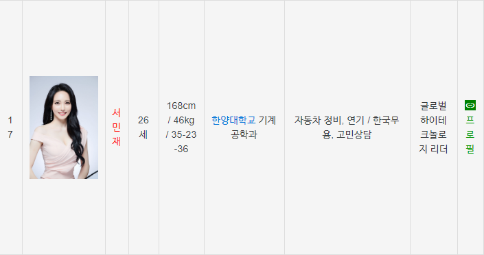 현재 서울시 영등포구 거주중인 서민재는 과거 미스코리아 출전 이력을 보유하고 있다. 2019 미스코리아 경북 후보자 17번으로 이름을 올린 서민재 나이는 168cm의 키와 46kg 몸무게 그리고 쓰리 사이즈 가슴 35 허리 23 엉덩이 36의 몸매 프로필을 공개하였다.